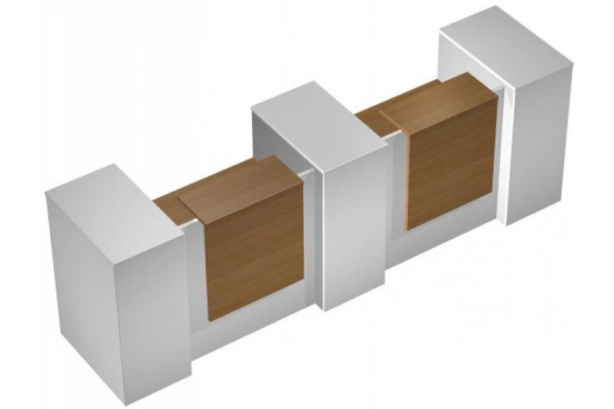 Ламинированная ДСтП, кромка ПВХ Столешница и полка ресепшн - 25 мм «орех ногаро»; кромка ПВХ 2 мм. Передняя панель, боковые стенки и крышки тумб - 25 мм «белый премиум»; кромка ПВХ 2 мм. Фасады ящиков - 18 мм «орех ногаро»; кромка ПВХ 2 мм. Подвесная полка, задние стенки тумб -18 мм «белый премиум»; кромка ПВХ 0,4 мм Ручки выдвижных ящиков - металлические круглые врезные, хром матовый. Особенности: Изделие рассчитано на два рабочих места Изделие состоит из двух прямых модулей и трех тумб 4-х ящичных для документов с нишей Изделие укомплектовано двумя столешницами Наличие выреза 300х150 мм в каждой столешнице и двух подвесных полок для удобства размещения мониторов Изделие укомплектовано двумя полками ресепшн Ширина полок ресепшн 320 мм Величина проема между полками ресепшн и столешницами 380 мм Наличие металлических кронштейнов, обеспечивающих жесткость установки полок ресепшн Конструктивная возможность установки кабель-каналов ВТ 409 Конструктив изделия не предусматривает изменения взаимного положения тумб Тумбы для документов имеют нишу высотой 380 мм и 4 выдвижных ящика, верхний из которых запирается на замок Корпус выдвижного ящика - металлический (метабокс). Изделие собирается на эксцентриковой стяжке Изделие имеет регулировочные опоры Поставляется в разобранном виде