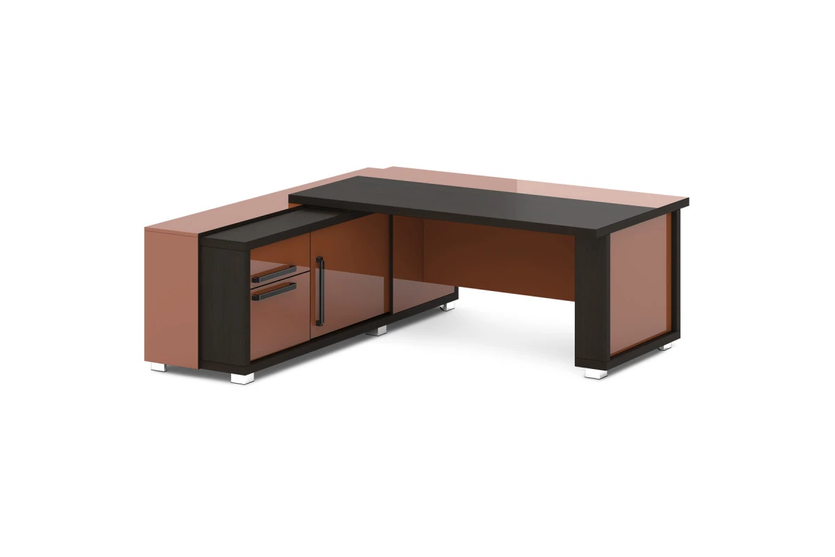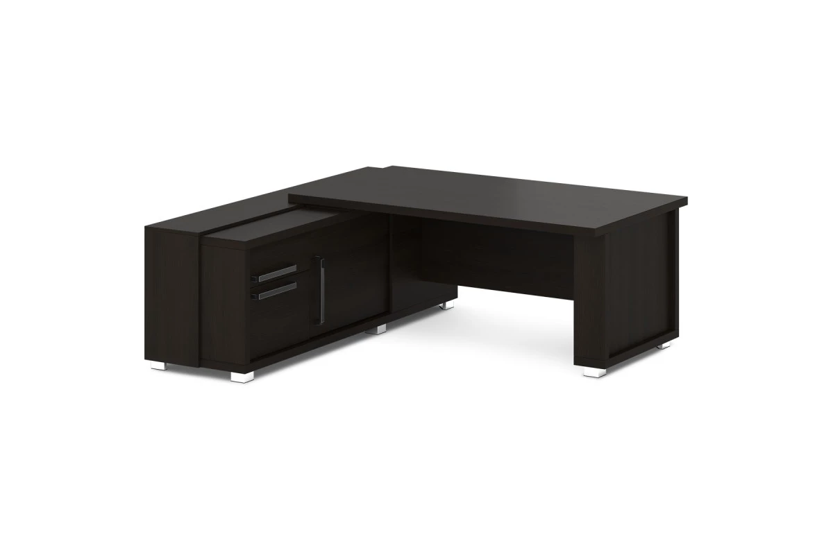 Стол руководителя с греденцией. Греденция имеет 3 ящика (2 внешних и 1 внутренний) на шариковых направляющих скрытого монтажа полного выдвижения, обладающих плавным ходом и оборудованных доводчиками. Оснащена отсеком с переставной полкой или местом под сейф с дверью-купе. Размер отсека - 600х490х554. Стол состоит из сборной опоры и тумбы-греденции, служащей опорой, столешницы и соединительного щита. Стол левый – тумба-греденция с левой стороны, сборная опора – с правой стороны. Стол правый – тумба-греденция с правой стороны, сборная опора – с левой стороны. На рис. - правый.,Размеры: 2035х2016х750. Размер столешницы: 1800х1000.,Столешница комбинированная, изготавливается из ЛДСП толщиной 43 мм. Торцы столешницы облицованы кромкой ABS толщиной 2 мм, цвет «Дуб Линдберг темный». Соединительный щит – ЛДСП 18 мм с лаковым покрытием, торцы облицованы кромкой ABS толщиной 2 мм, цвет «Дуб Линдберг темный». Каркасы тумбы и сборной опоры изготавливаются из ЛДСП 43 мм, торцы облицованы кромкой ABS толщиной 2 мм по всему периметру, цвет «Дуб Линдберг темный». Внутреннее наполнение сборной опоры – 2 щита из ЛДСП 18мм с лаковым покрытием. Сборная опора установлена на 2-х регулируемых опорах размером 80х80х48. Опоры 5-угольной формы, черные пластиковые, с металлической накладкой по периметру, покрытие «Хром блестящий».,Тумба-греденция имеет 3 ящика (2 внешних и 1 внутренний) на скрытых шариковых направляющих полного выдвижения с плавным закрыванием и оснащена отсеком под сейф с переставной полкой и дверью-купе. Внешние фасады, дверь-купе и передняя стенка греденции изготавливаются из ЛДСП 18 мм с лаковым покрытием, торцы облицованы кромкой ABS толщиной 2 мм, цвет «Дуб Линдберг темный». Боковины ящиков – ЛДСП 16 мм, цвет «Металлик», облицованы кромкой ABS толщиной 2 мм в цвет плиты. Остальные элементы изготавливаются из ЛДСП 18 мм, торцы облицованы кромкой ABS толщиной 2 мм в цвет плиты. На каркас тумбы-греденции крепятся топ и 2 дополнительных бока из ЛДСП 18 мм с лаковым покрытием. Боковые торцы топа облицованы кромкой ABS толщиной 1 мм в цвет плиты, остальные торцы облицованы кромкой ABS толщиной 2 мм, цвет «Дуб Линдберг темный». Ручка-скоба металлическая, межцентровое расстояние 320 мм, цвет – черный глянец со шлифованными гранями. Тумба установлена на 6-и регулируемых опорах размером 80х80х48. Опоры 5-угольной формы, черные пластиковые, с металлической накладкой по периметру, покрытие «Хром блестящий».,Стол собирается на эксцентриковых стяжках, конфирматах и шкантах, что позволяет многократную сборку-разборку мебели. Эксцентрики закрываются самоклеющимися заглушками в цвет плиты.