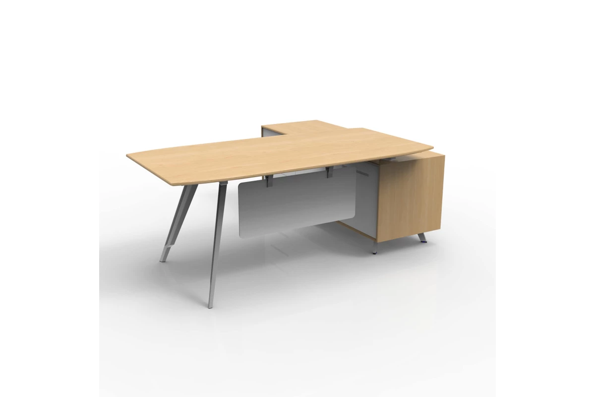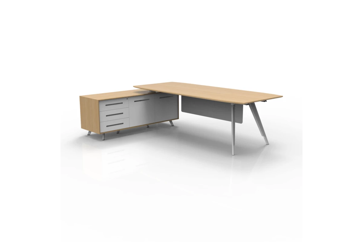 Стол руководителя EA87L.200181 Kross на опорной сервисной тумбе, левый. Материал столешницы - МДФ E0 класса облицованный натуральным шпоном. Кромка массив дерева, 5мм. Опорная тумба - топы, боковины, задняя стенка - МДФ+ шпон. Фасады МДФ+ белый лак. Центральный замок. 5 алюминиевых опор с регулировкой неровности пола. Каркас и опоры из белого алюминиевого сплава. Электрификация - беспроводная зарядка в столе. Опорная тумба -встроенная металлическая коробка с заглушкой, включая 3 зарезервированных гнезда и 2 зарядных устройства USB.