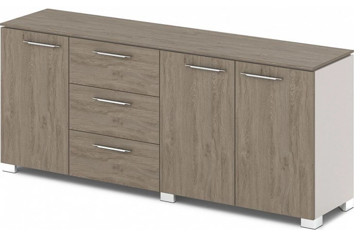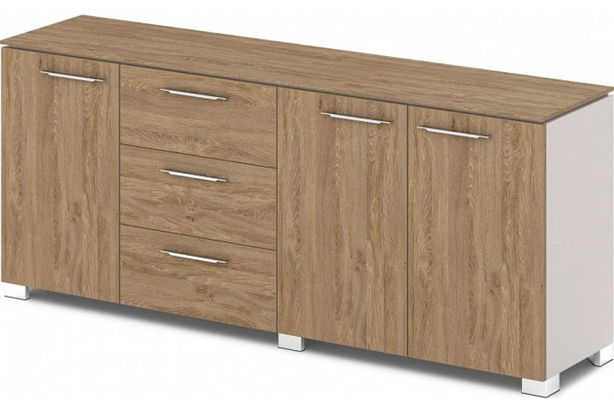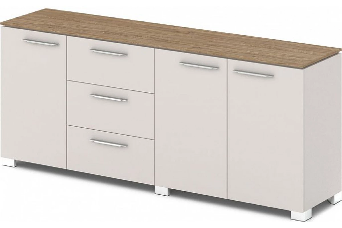 Офисный низкий шкаф для документов комбинированный. Артикул: G-70. Размеры: 1920х442х805.,Шкаф низкий комбинированный состоит из 3-х отделений. Слева отделение с одной распашной дверью, в центре – отделение с 3-мя ящиками, справа – отделение с двумя распашными дверями. Бока шкафа и фасады выполнены из ЛДСП толщиной 18 мм, облицованы кромкой ABS толщиной 2 мм в цвет плиты. Горизонтали, низ и перегородки шкафа изготовлены из ЛДСП 25 мм, облицованы кромкой ABS толщиной 2 мм в цвет плиты. Топ шкафа приподнят над каркасом на 9 мм, изготовлен из ЛДСП 12 мм, облицован кромкой ABS 2мм в цвет плиты. Задняя стенка из ЛДСП устанавливается в пазы. Ящики – на шариковых направляющих полного выдвижения, с механизмом плавного закрывания. Бока ящика изготовлены из ЛДСП толщиной 12 мм. Дно ящиков – ЛДСП.,Шкаф собирается на эксцентриковых стяжках, конфирматах и шкантах. В эксцентрики вставляются пластиковые заглушки в цвет плиты. На каркас шкафа навешиваются двери из ЛДСП толщиной 18 мм, облицованные кромкой ABS 2 мм в цвет плиты. Двери – накладные с вертикальной осью вращения, крепятся с помощью 4-хшарнирных петель с углом открывания 110 градусов, с механизмом плавного закрывания. Ручка-скоба металлическая плоская, межосевое расстояние 160 мм, размером 234х22х8 мм, покрытие «Хром блестящий». Шкаф установлен на 6-и регулируемых опорах размером 80х80х48 мм. Опоры 5-угольной формы, черные пластиковые, с металлической накладкой по периметру, покрытие «Хром блестящий». Для бесшумного закрывания дверей и ящиков применяются фетровые отбойники серого цвета.,Шкаф исполняется только в комбинации древоподобного цвета с цветом «Бежевый песок» или полностью в цвете «Бежевый песок».