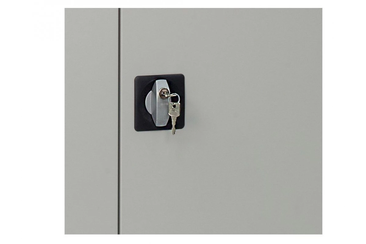 ригели из оцинкованной стали и пластиковые втулки обеспечивают бесшумный ход дверей и надежное запирание шкафа