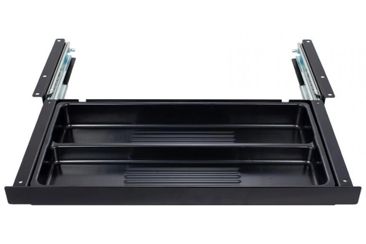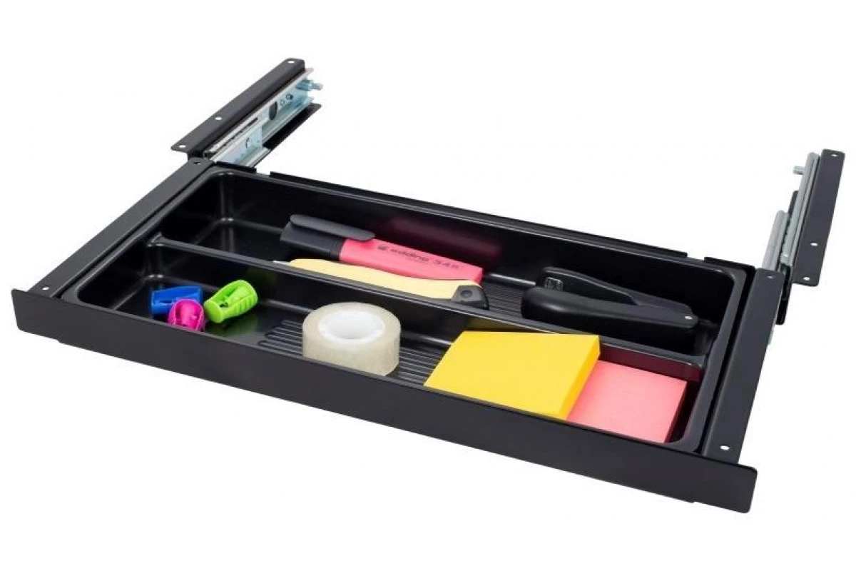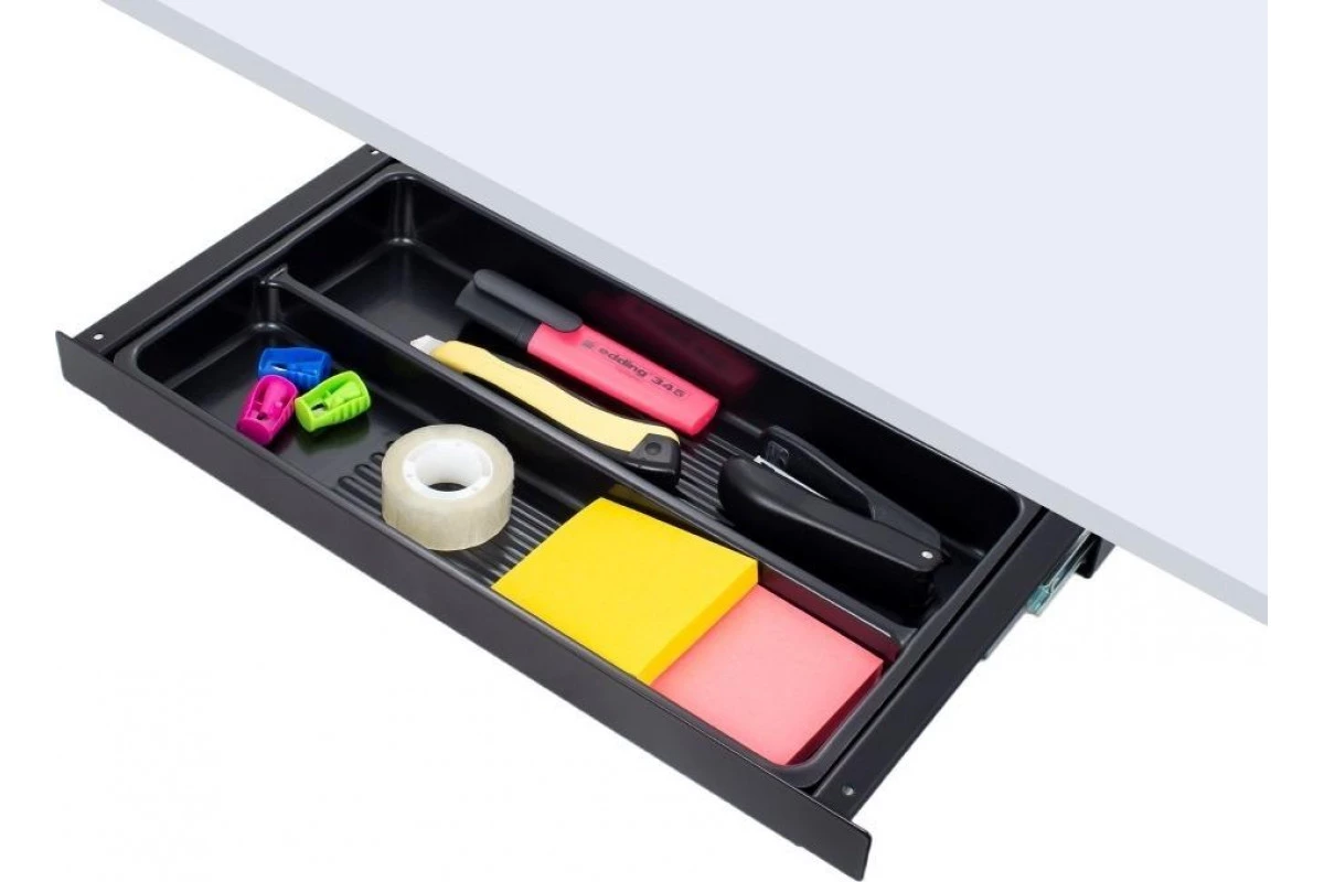 Выдвижной ящик-органайзер для канцелярских принадлежностей, малый. Габариты (ШxГxВ): 425x186x43 мм. 2 отделения. Полезное пространство: 349x184x30 мм. Телескопические направляющие с плавным ходом. Монтаж: под стол. Материал: металл, пластик, черный