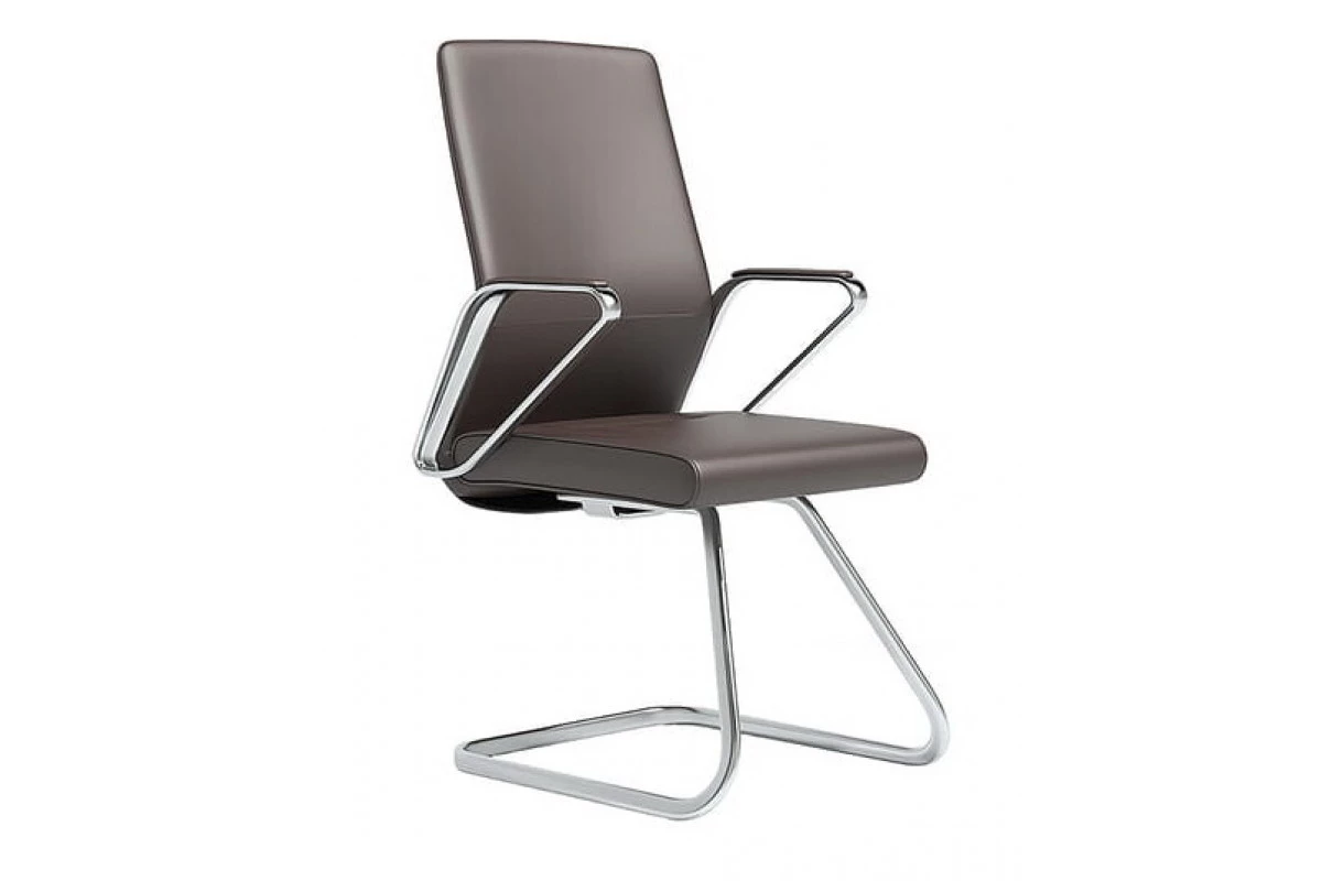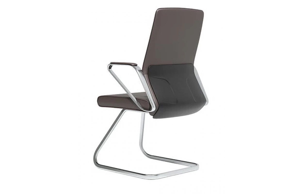 Переговорный стул на хром полозьях, формованное ппу, обивки спинки и сиденья - кожа с компаньоном, спинка тонкая, подлокотники алюминиевые.