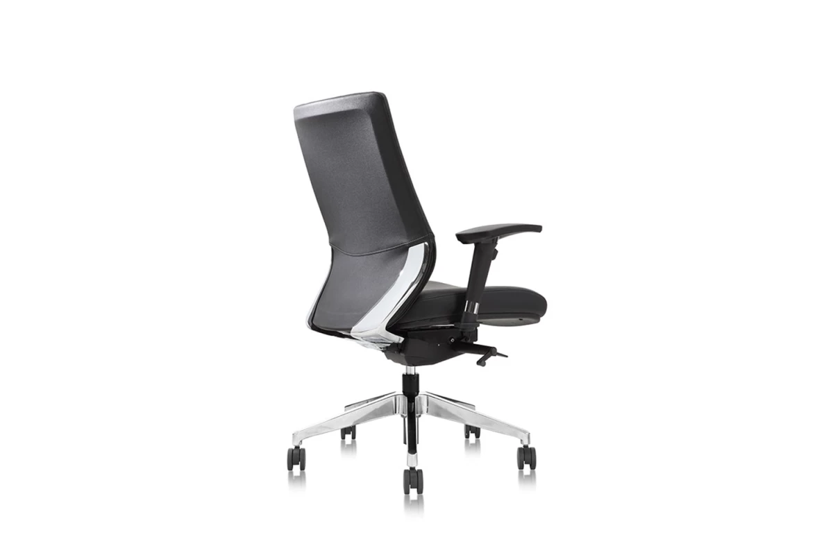 Кресло с низкой спинкой, спинка и сидение кожа люкс с компаньоном, формованное сиденье, мягкие подлокотники регулируются по высоте, DONATI синхромеханизм по весу с возможностью фиксации в 4 положениях, сиденье регулируется по глубине, по жёсткости спинки, алюминиевая полированная крестовина