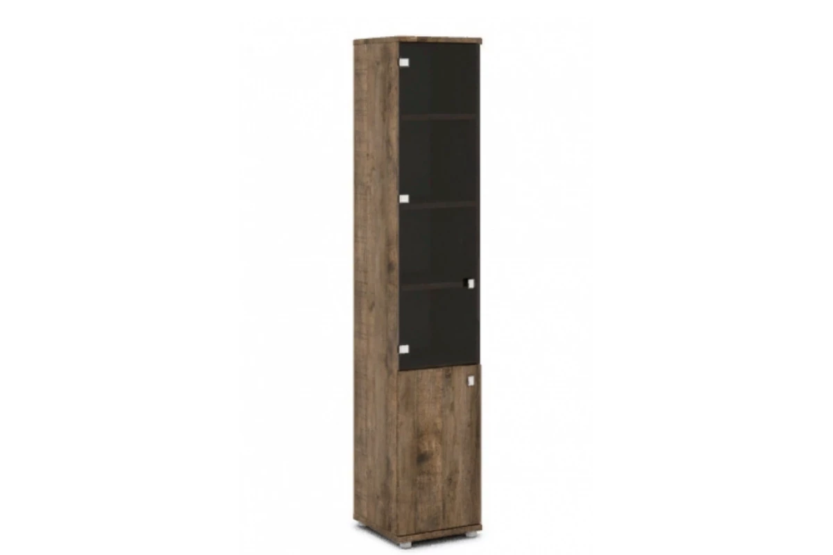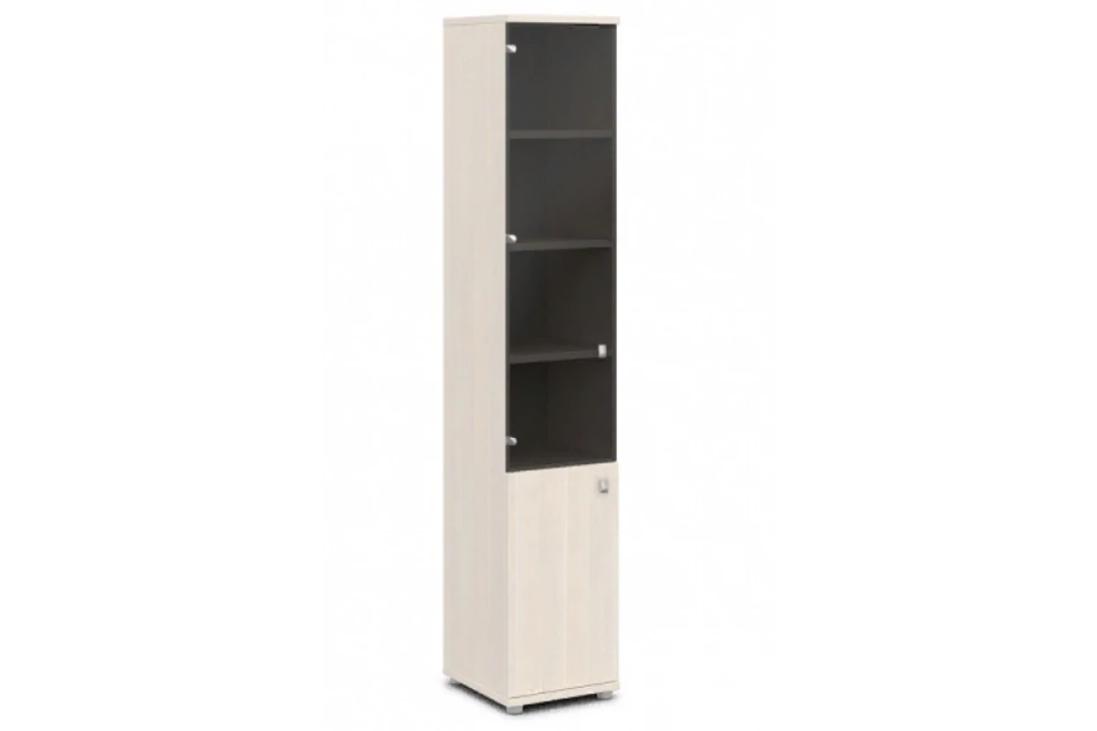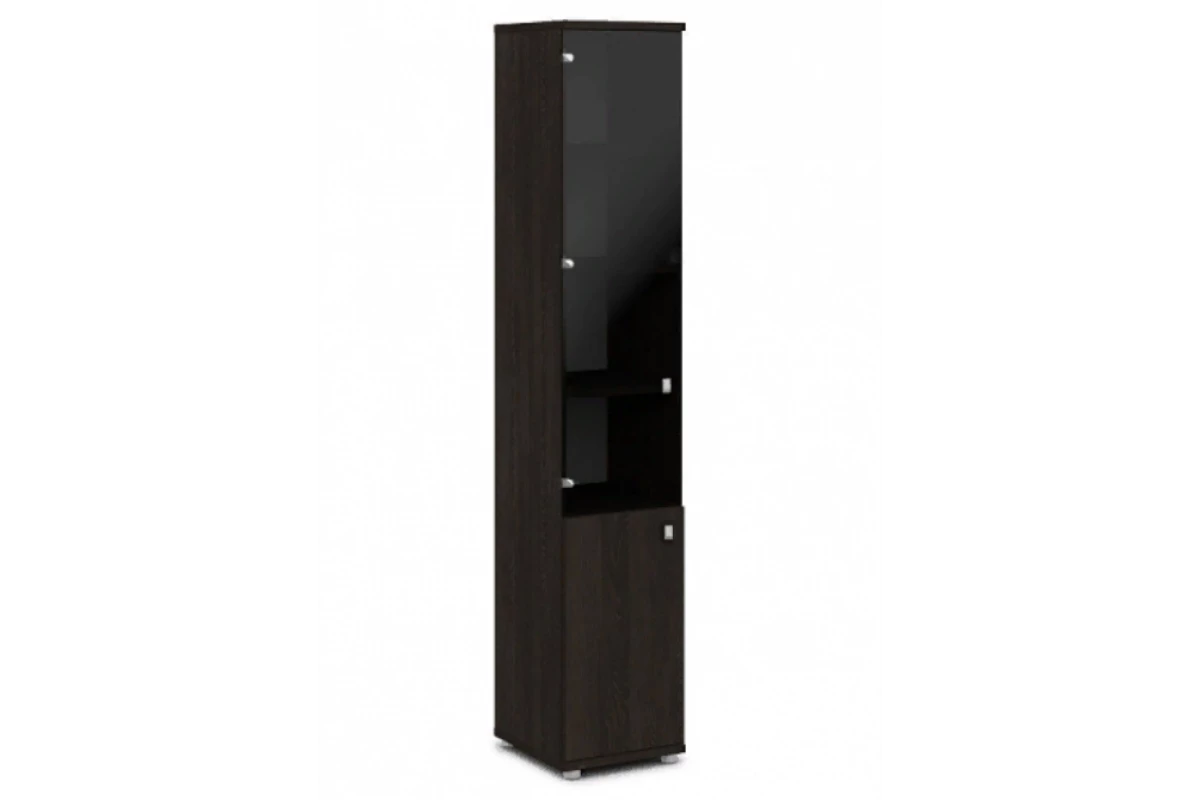 Офисный шкаф для документов высокий узкий закрытый со стеклом 6 полками и 2 дверями. Состоит из стеллажа V-55 и дверей V-011л/п и V-023. На фото - левый.,Артикул: V-502 л/п. Размеры: 412x440x2195. Верх, низ и горизонтали шкафа изготавливаются из ЛДСП толщиной 25 мм. Торцы облицованы кромкой ПВХ толщиной 2 мм и 0,4 мм в цвет плиты. Каркас из ЛДСП 16 мм, облицован кромкой ПВХ в цвет плиты. Задняя стенка ХДФ толщиной 3.5 мм в цвет плиты. Шкаф собирается на эксцентриковых стяжках и шкантах, что позволяет многократную сборку-разборку мебели. В эксцентрики вставляются пластиковые заглушки в цвет плиты. В основании шкафа 4 регулируемые опоры высотой 27 мм, диаметром 50 мм, с возможностью регулировки высоты стеллажа на 10 мм. Цвет опоры «серый». Ручка – кнопка с поднимающимся язычком, материал - цинковое литье, цвет хром матовый.