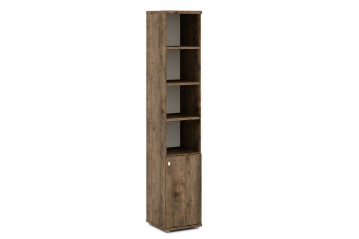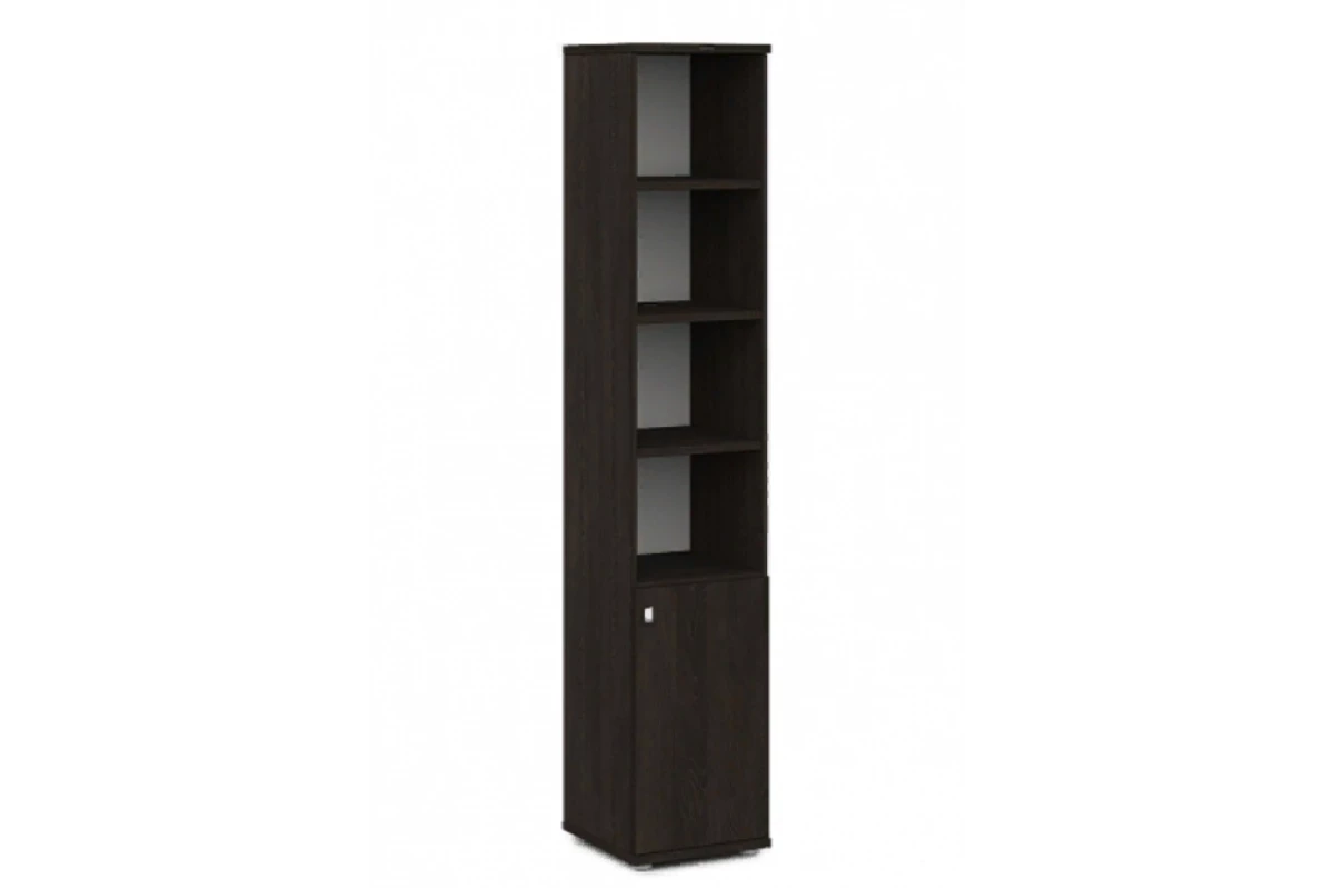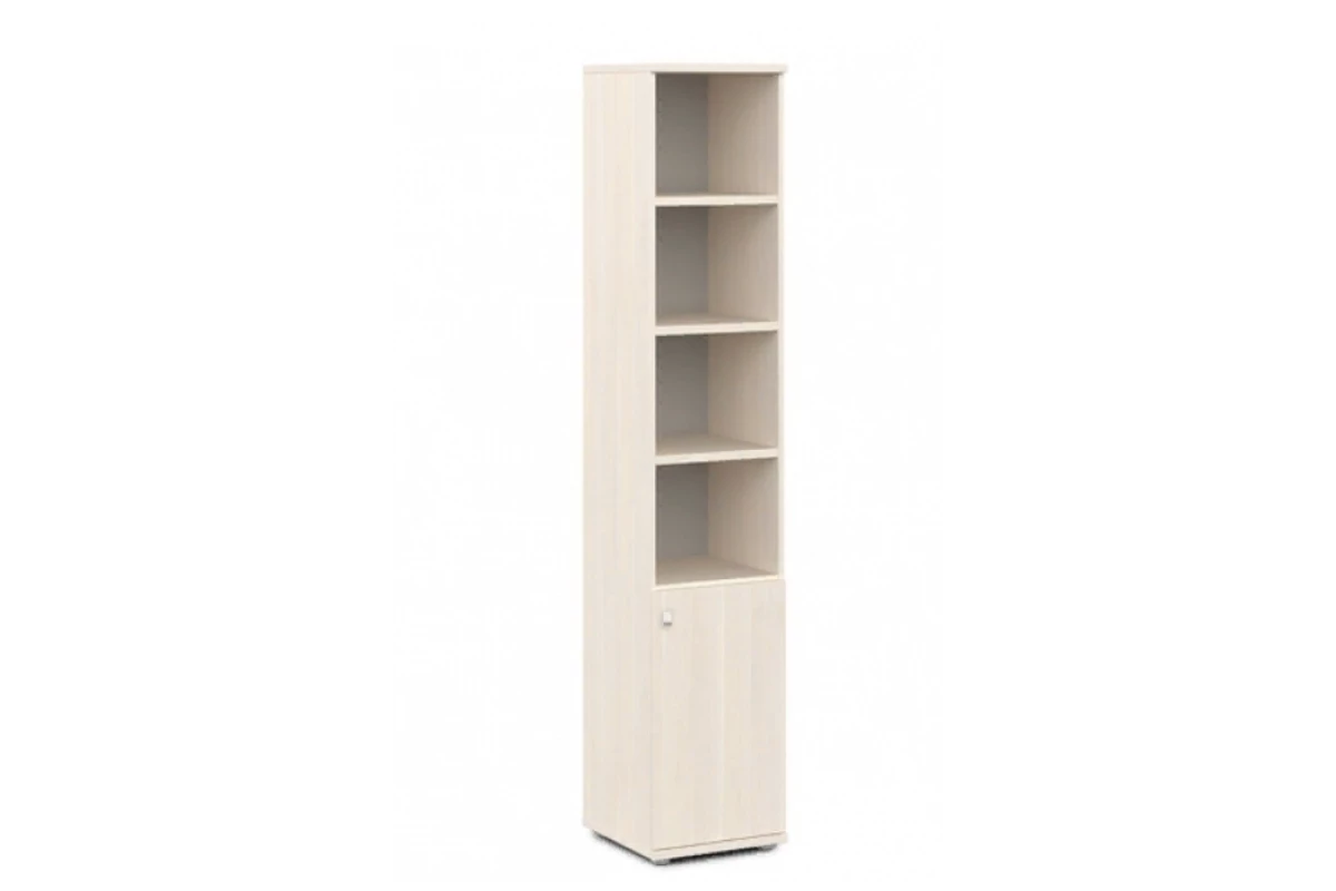 Офисный шкаф для документов высокий узкий полуоткрытый с 6 полками и 1 дверью. Состоит из стеллажа высокого V-55 и двери V-011 пр/л. На фото - левый.,Артикул: V-503пр/л. Размеры: 412x440x2195. Верх, низ и горизонтали шкафа изготавливаются из ЛДСП толщиной 25 мм. Торцы облицованы кромкой ПВХ толщиной 2 мм и 0,4 мм в цвет плиты. Каркас из ЛДСП 16 мм, облицован кромкой ПВХ в цвет плиты. Задняя стенка ХДФ толщиной 3.5 мм в цвет плиты. Двери из ЛДСП 16 мм, облицованы кромкой ПВХ в цвет плиты. Шкаф собирается на эксцентриковых стяжках и шкантах, что позволяет многократную сборку-разборку мебели. В эксцентрики вставляются пластиковые заглушки в цвет плиты. В основании шкафа 4 регулируемые опоры высотой 27 мм, диаметром 50 мм, с возможностью регулировки высоты стеллажа на 10 мм. Цвет опоры «серый». Ручка – кнопка с поднимающимся язычком, материал - цинковое литье, цвет хром матовый.
