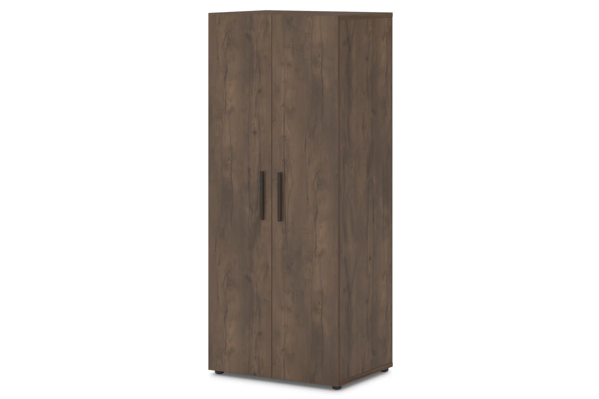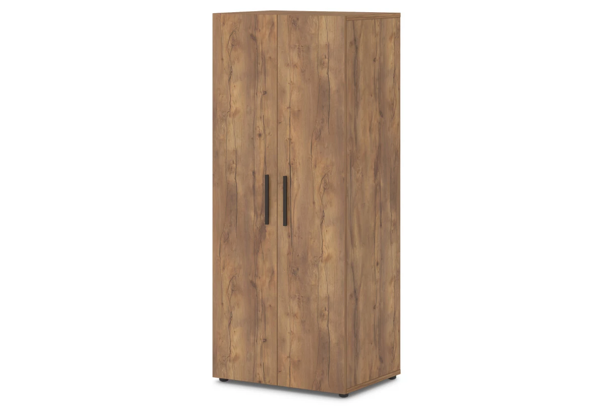 Офисный шкаф для одежды комбинированный, продольная вешалка-штанга, полки.,Артикул: Т-771. Размер: 820х600х1970. ЛДСП: 25 мм, 18 мм, 10 мм. Кромка: ABS 2 мм и 0,4 мм.,Шкаф для одежды комбинированный. Шкаф разделен перегородкой на две половины. С одной стороны пять полок. С другой продольная овальная вешалка штанга и отделения для головных уборов и обуви. Верх, низ, горизонтали, полки изготовлены из ЛДСП 25 мм и оклеены противоударной кромкой ABS 0,4 мм. Бока, перегородка изготовлены из ЛДСП 18 мм и оклеены противоударной кромкой ABS 0,4 мм. Задняя стенка изготовлена из ЛДСП 10 мм. Двери изготовлены из ЛДСП 18 мм и оклеены противоударной кромкой ABS 2 мм. Опоры шкафа снабжены компенсатором неровности пола. Петли оснащены механизмом плавного закрывания. Все соединительные элементы оснащены фурнитурой для многократной сборки и разборки изделия. Используется фурнитура ведущих европейских производителей.
