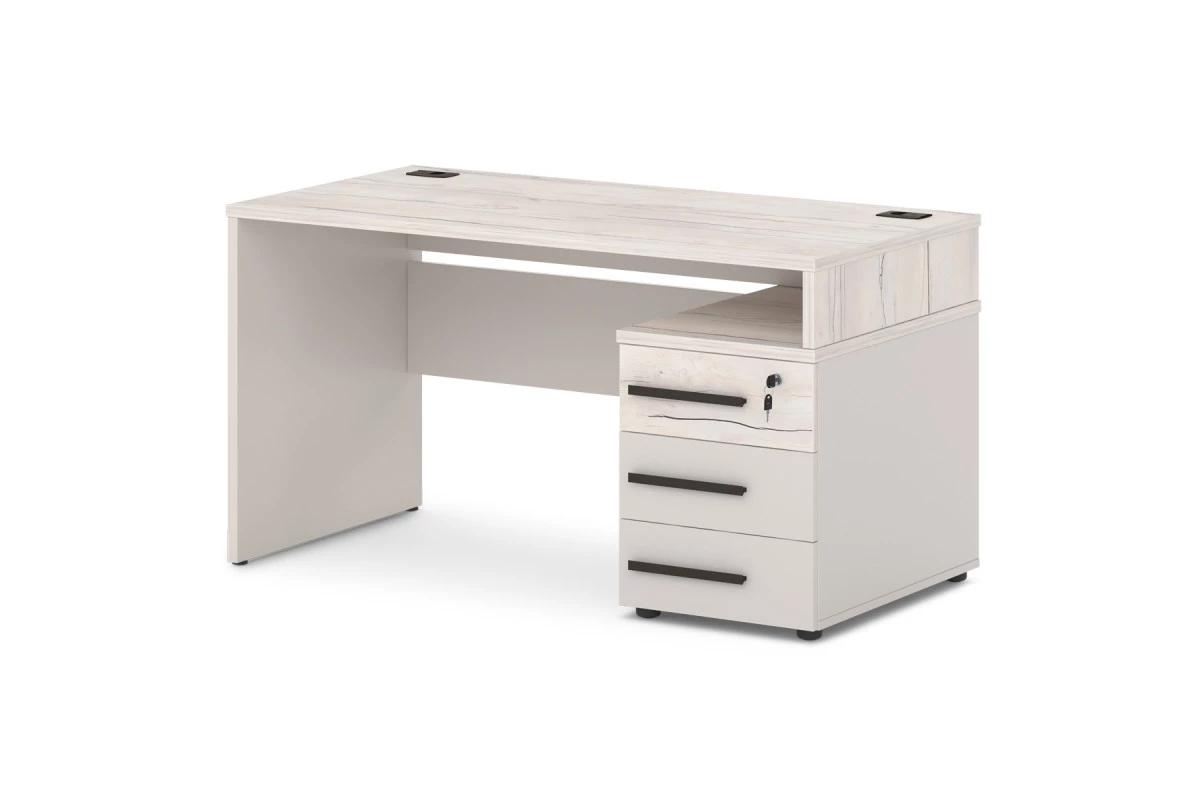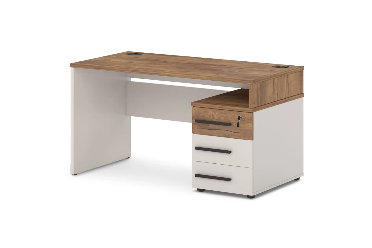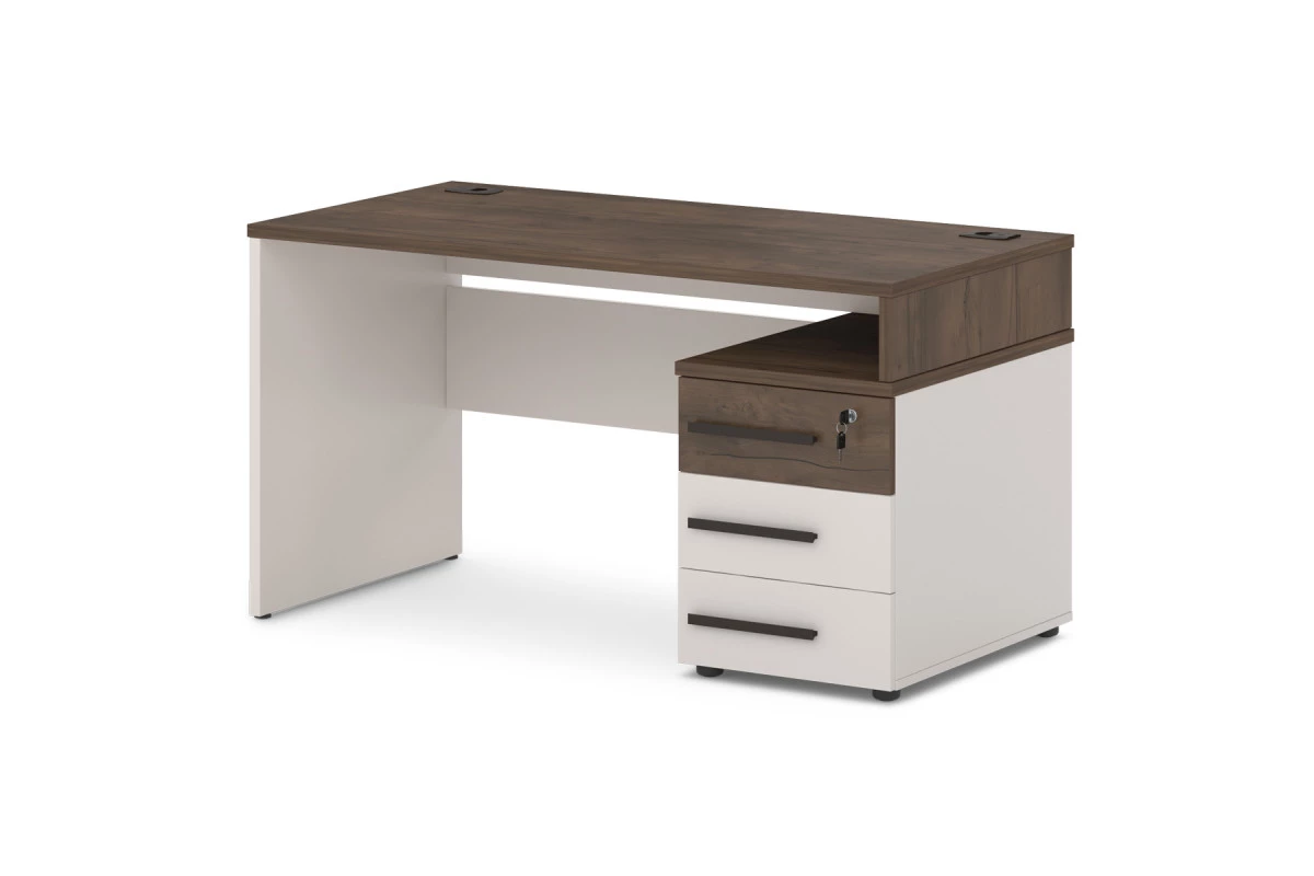 Офисный стол с опорной тумбой с 2-мя заглушками кабель-канала. Декоры: столешница и промежуточный бок - Таксония, остальные детали - Бежевый песок.,Опорная тумба может быть установлена на левую или правую сторону. На фото - правый стол.,Артикул: Т-22л/пр. Размер: 1400х700х750. ЛДСП: 25 мм и 18 мм. Кромка: ABS 2 мм и 0,4 мм. Размер столешницы: 1400х700х25. Размер тумбы: 450x700x574.,Столешница изготовлена из ЛДСП 25 мм и оклеена противоударной кромкой ABS 2 мм. Бока изготовлены из ЛДСП 25 мм и оклеены противоударной кромкой ABS 2 мм и кромкой ABS 0,4 мм. Соединители изготовлены из ЛДСП 18 мм и оклеены противоударной кромкой ABS 0,4 мм. В столешнице установлены два кабель-канала. Опоры стола снабжены компенсатором неровности пола. Тумба опорная имеет три ящика на шариковых направляющих полного выдвижения с механизмом плавного закрывания. Верхний ящик оснащен замком. Верх изготовлен из ЛДСП 25 мм и оклеен противоударной кромкой ABS 2 мм. Низ, бока тумбы, бока и задние стенки ящиков изготовлены из ЛДСП 18 мм и оклеены противоударной кромкой ABS 0,4 мм. Дно ящиков ХДФ «Серое». Задняя стенка тумбы изготовлена из ЛДСП 25 мм. Фасады изготовлены из ЛДСП 18 и оклеены противоударной кромкой ABS 2 мм. Опоры тумбы снабжены компенсатором неровности пола. Все соединительные элементы оснащены фурнитурой для многократной сборки и разборки изделия. Используется фурнитура ведущих европейских производителей.