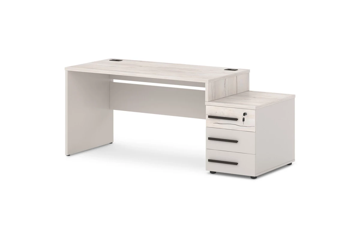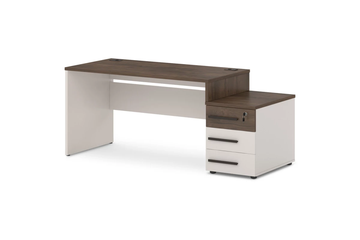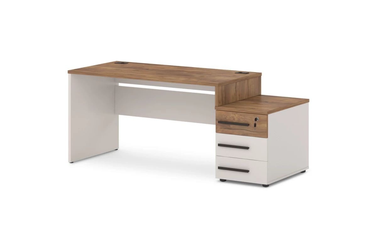 Офисный стол с опорной тумбой с 2-мя заглушками кабель-канала. Декоры: столешница и промежуточный бок - Таксония, остальные детали - Бежевый песок.,Опорная тумба может быть установлена на левую или правую сторону. На фото - правый стол.,Артикул: Т-25л/пр. Размер: 1818х700х750. ЛДСП: 25 мм и 18 мм. Кромка: ABS 2 мм и 0,4 мм. Размер столешницы: 1400х700х25. Размер тумбы: 450x700x574.,Столешница изготовлена из ЛДСП 25 мм и оклеена противоударной кромкой ABS 2 мм. Бока изготовлены из ЛДСП 25 мм и оклеены противоударной кромкой ABS 2 мм и кромкой ABS 0,4 мм. Соединители изготовлены из ЛДСП 18 мм и оклеены противоударной кромкой ABS 0,4 мм. В столешнице установлены два кабель-канала. Опоры стола снабжены компенсатором неровности пола. Тумба опорная имеет три ящика на шариковых направляющих полного выдвижения с механизмом плавного закрывания. Верхний ящик оснащен замком. Верх изготовлен из ЛДСП 25 мм и оклеен противоударной кромкой ABS 2 мм. Низ, бока тумбы, бока и задние стенки ящиков изготовлены из ЛДСП 18 мм и оклеены противоударной кромкой ABS 0,4 мм. Дно ящиков ХДФ «Серое». Задняя стенка тумбы изготовлена из ЛДСП 25 мм. Фасады изготовлены из ЛДСП 18 и оклеены противоударной кромкой ABS 2 мм. Опоры тумбы снабжены компенсатором неровности пола. Все соединительные элементы оснащены фурнитурой для многократной сборки и разборки изделия. Используется фурнитура ведущих европейских производителей.