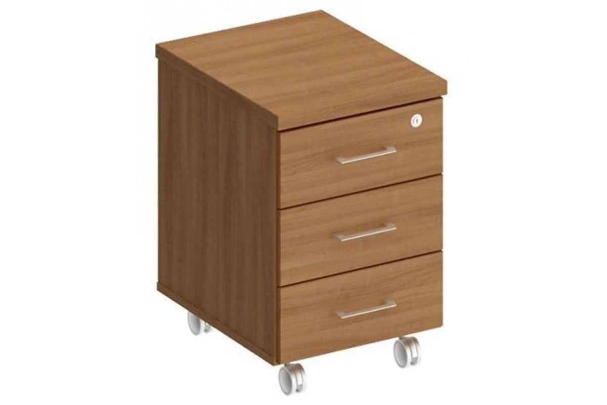 Ламинированная ДСтП, кромка ПВХ Топ тумбы – 32 мм, кромка ПВХ 2 мм. Каркас и фасады ящиков – 18 мм, кромка ПВХ 0,4 мм. Ручки – металлические, цвет – «сатин» Особенности: Тумба имеет 3 выдвижных ящика, установленных на роликовые направляющие Тумба укомплектована «центральным» замком, блокирующим все ящики тумбы одновременно Тумба устанавливается на колесные опоры Тумба поставляется в собранном виде