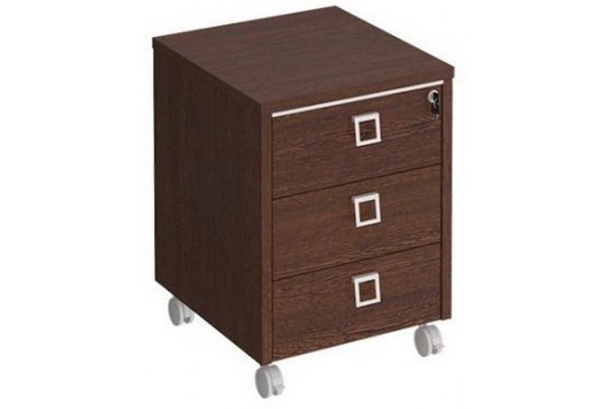 Ламинированная ДСтП, кромка ПВХ Каркас и топ тумбы - 25 мм, кромка ПВХ 2 мм. Задняя стенка и фасады ящиков - 16 мм, кромка ПВХ 0,4 мм. Ручки - металлические в виде рамки квадратного сечения, цвет - «сатин» Особенности: Декоративная проставка серебристого цвета установлена с фасадной стороны тумбы Тумба имеет 3 выдвижных ящика, установленных на роликовые направляющие Тумба укомплектована «центральным» замком, блокирующим все ящики тумбы одновременно Тумба устанавливается на колесные опоры, две из них имеют стопор Тумба поставляется в собранном виде