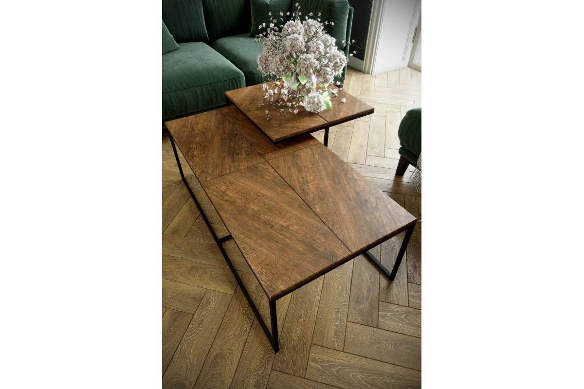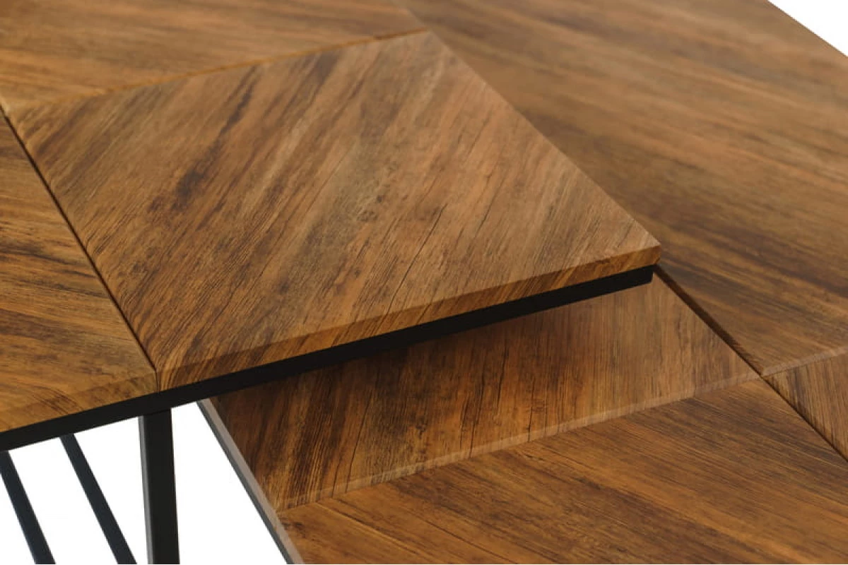 Оригинальность столу "Эклектик" придает дизайн столешницы с необычным направлением текстуры пленки американского дуба. Лаконичность форм и практичность исполнения столика безусловно будет залогом отличного дизайнерского оформления гостиной. Металлический каркас выполнен из профильной трубы 15*15 мм, столешница выполнена из экологичного материала ЛМДФ, облицованного влагостойким декоративным покрытием.
