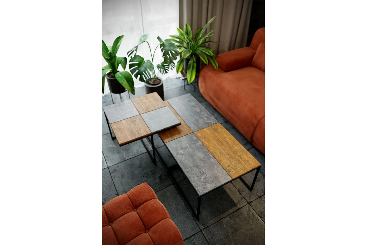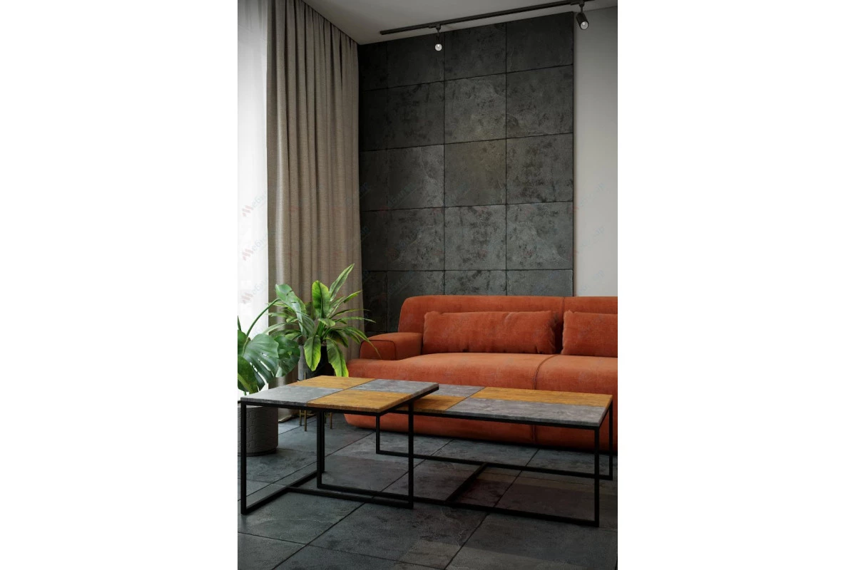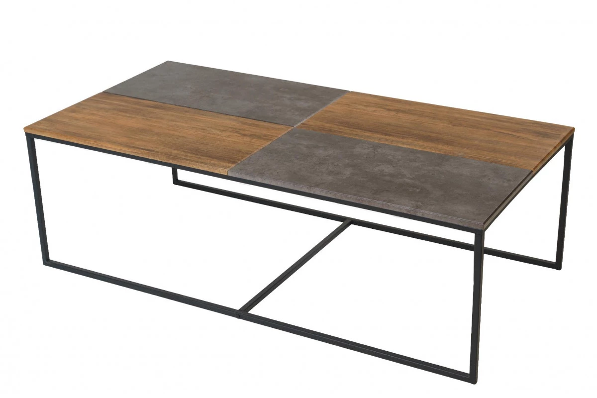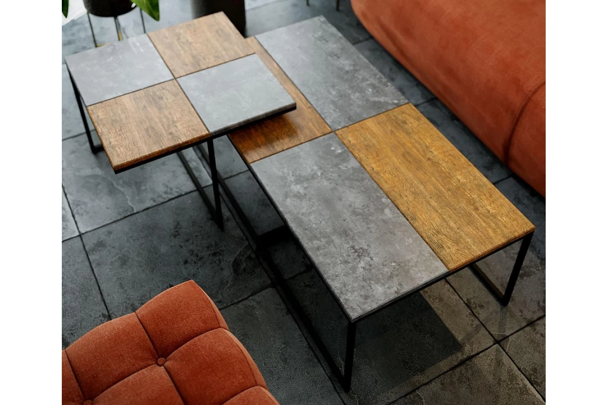 Основа стиля в столе "Фьюжн" заложена в подстолье, выполненном из металла и столешнице, которая сочетает простоту камня и естественность дерева. Таков дизайнерский прием сочетания декоративного покрытия в цвете дуб американский и серый бетон.